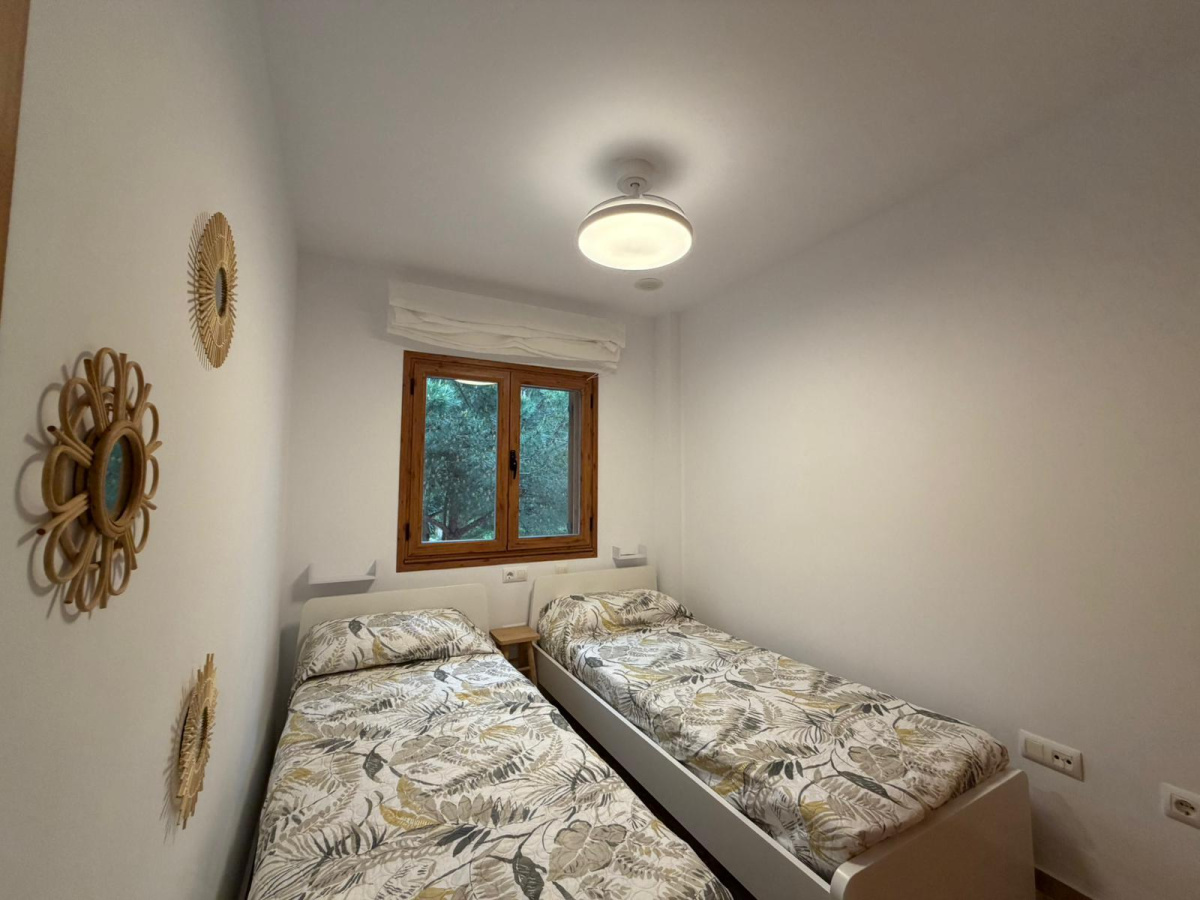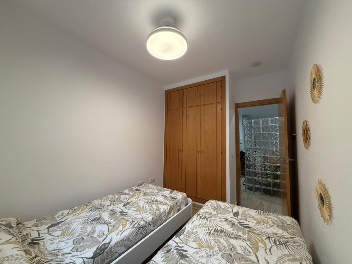 La vivienda situada en primera planta se compone de dos dormitorios, amplio salón con cocina americana , baño completo con plato de ducha y una terraza bonita privada con vistas a la piscina y zonas comunes. Aire acondicionado en salón y ventilador de techo en las habitaciones. Cuenta con todas las comodidades para disfrutar de unas vacaciones en familia en una de las mejores playas del país. Aparcamiento privado para un coche dentro de la urbanización